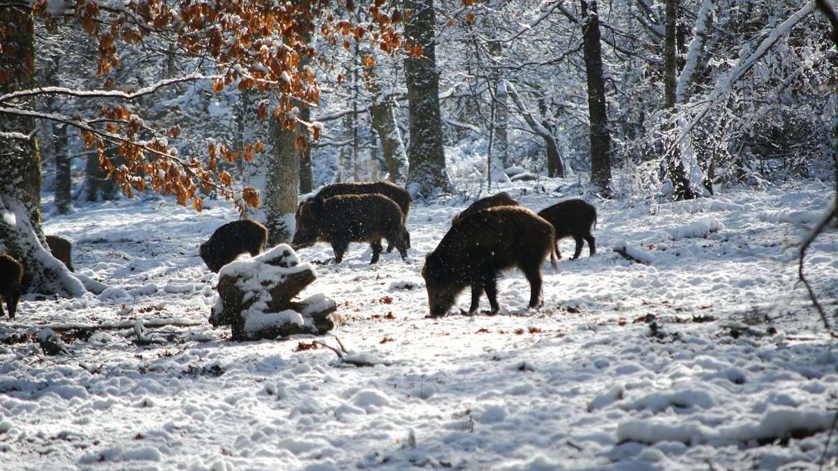 A group of wild boars foraging in a snow-covered forest, surrounded by frosty trees.