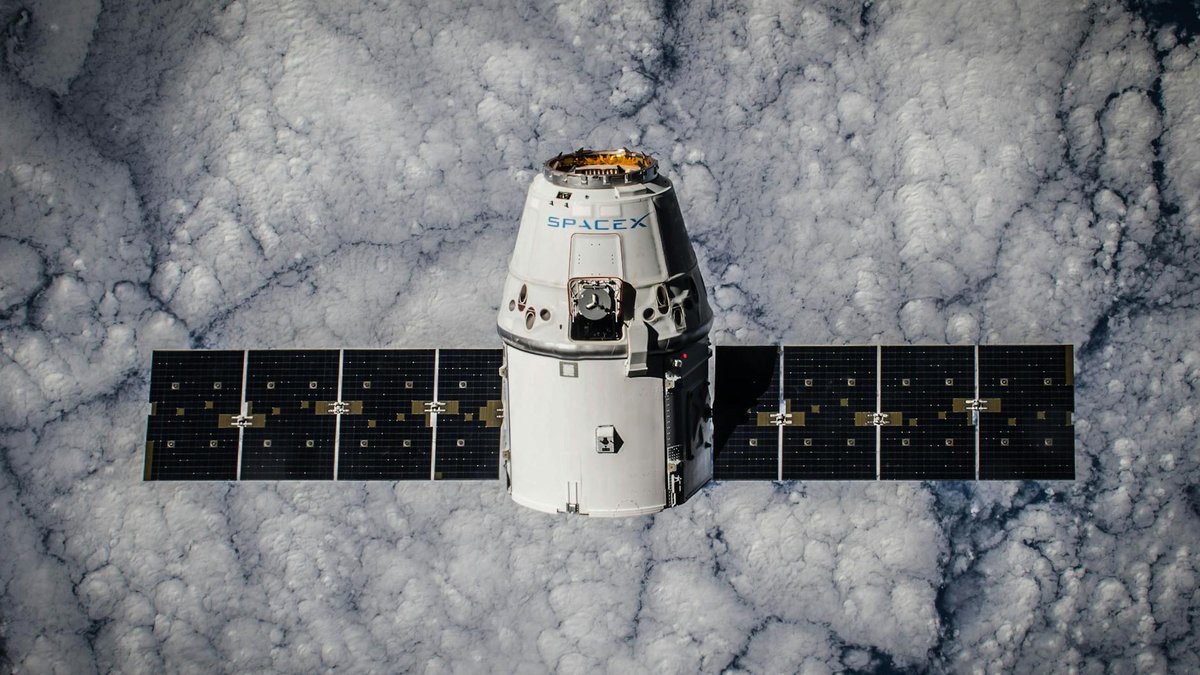 SpaceX Dragon spacecraft in orbit, highlighting advanced space technology with cloud backdrop.