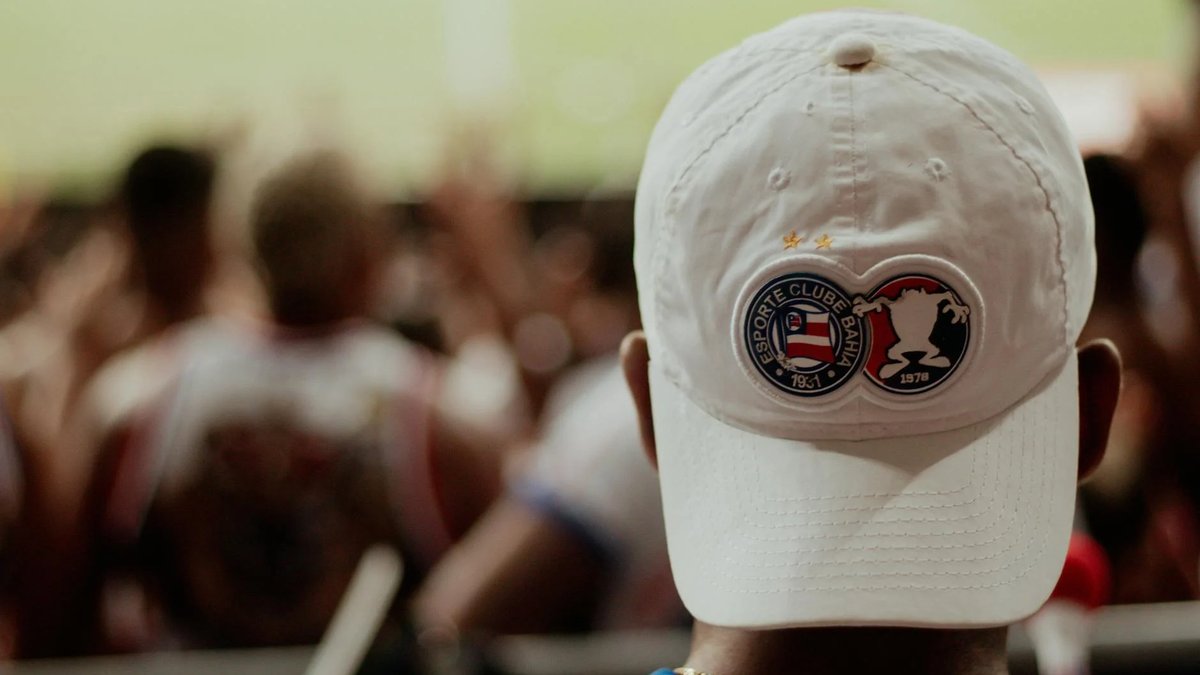 A dedicated football fan sport ing an Esporte Clube Bahia cap watches the game.