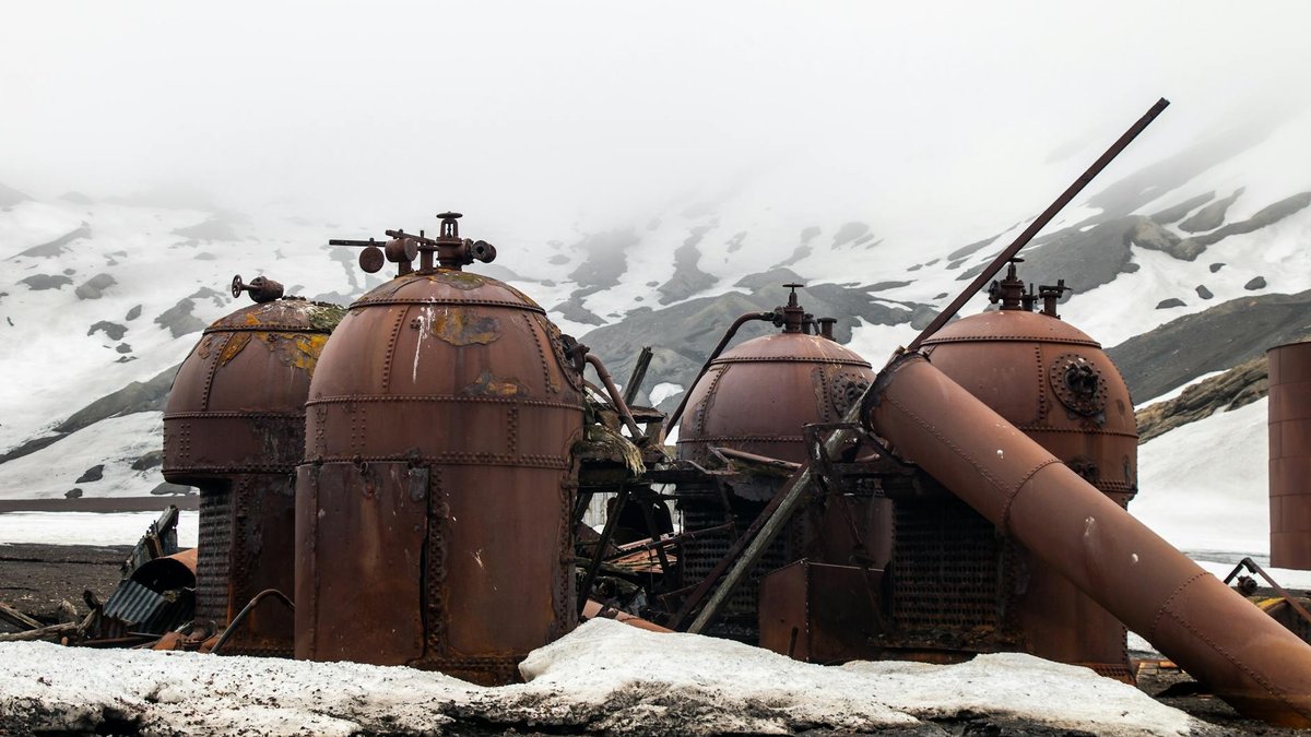 Old whaling station remnants on snowy landscape in Antarctica. Foto: ArcticDesire.com Polarreisen — Pexels License (livre para uso)