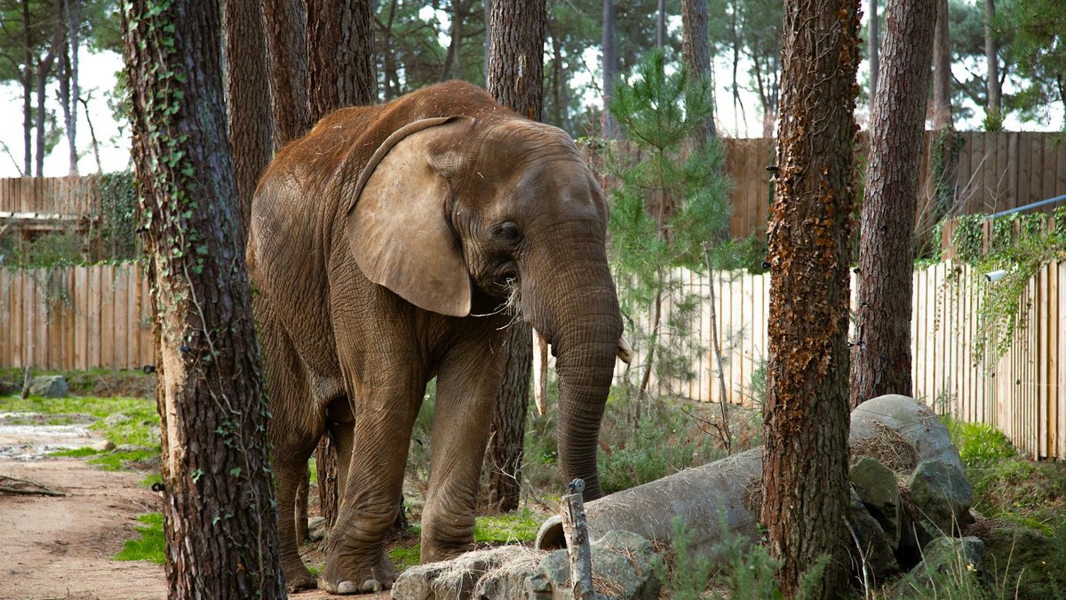 An African elephant strolling in a wooded zoo enclosure, showcasing its natural habitat. Foto: Harper Swan — Pexels License (livre para uso)
