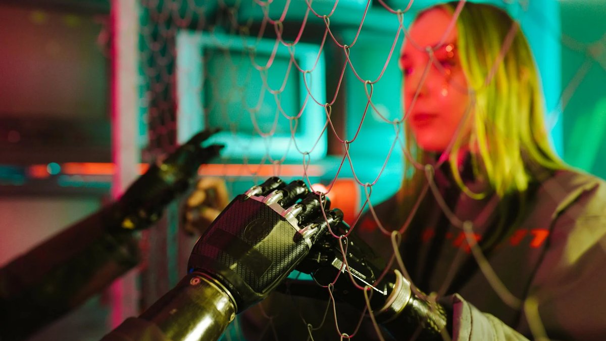 A woman interacts with robotic hands through a mesh displaying a neon cyberpunk atmosphere. Foto: Yaroslav Shuraev — Pexels License (livre para uso)