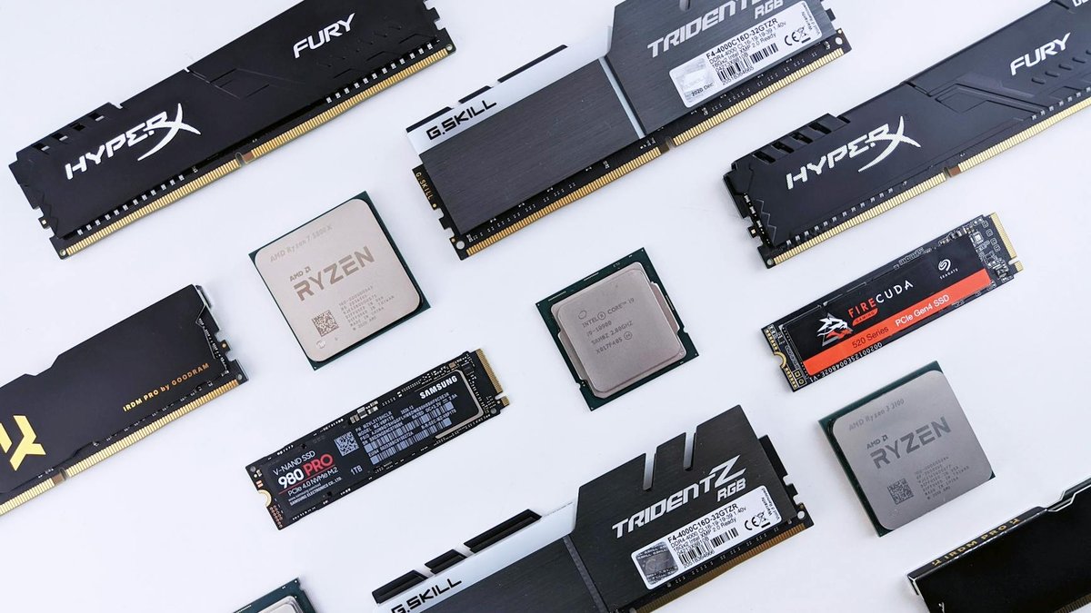 High-quality image of various computer components, including RAM and CPUs, on a white background.