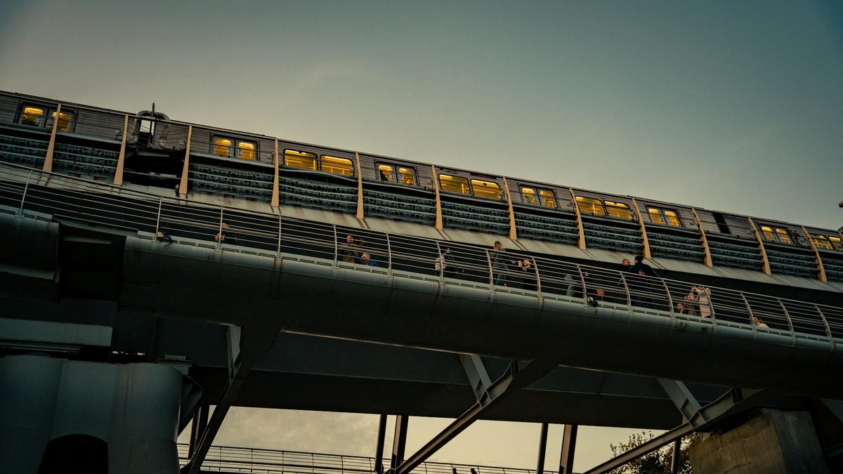 City train crosses an elevated bridge at sunset with people walking below. Urban transit scene. Foto: Zeynep Sude Emek — Pexels License (livre para uso)