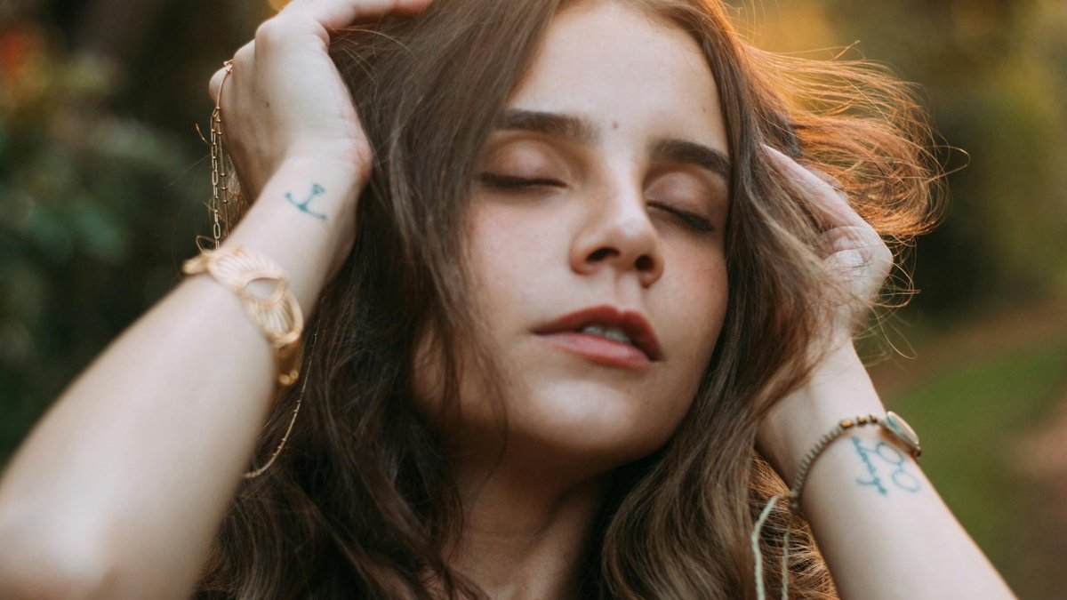 Close-up portrait of a serene woman outdoors, eyes closed, at sunset in Dourados, Brazil. Foto: Giovana Lhopi — Pexels License (livre para uso)