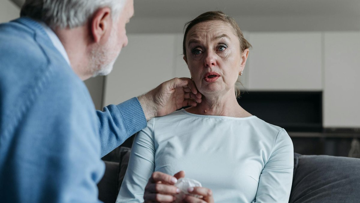 A heartfelt moment between an elderly couple, showcasing emotion and support indoors. Foto: Pavel Danilyuk — Pexels License (livre para uso)
