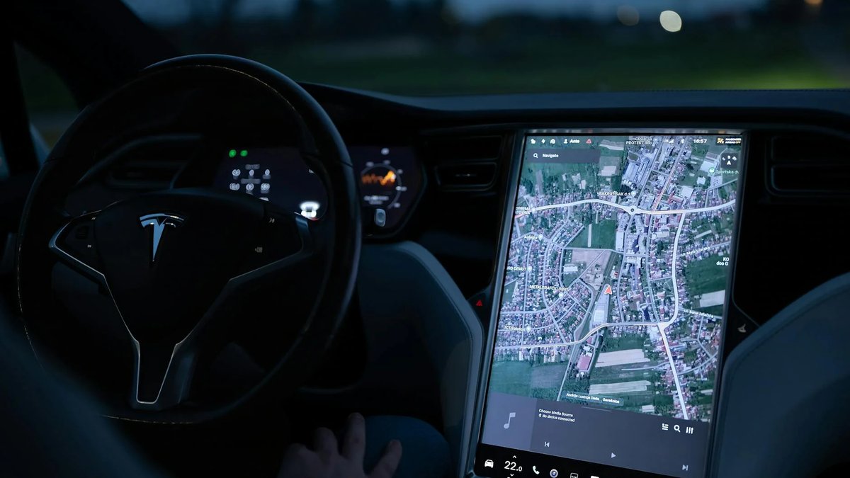 Explore the advanced touchscreen navigation in a modern electric vehicle's sleek interior at night. Foto: Vladimir Srajber — Pexels License (livre para uso)
